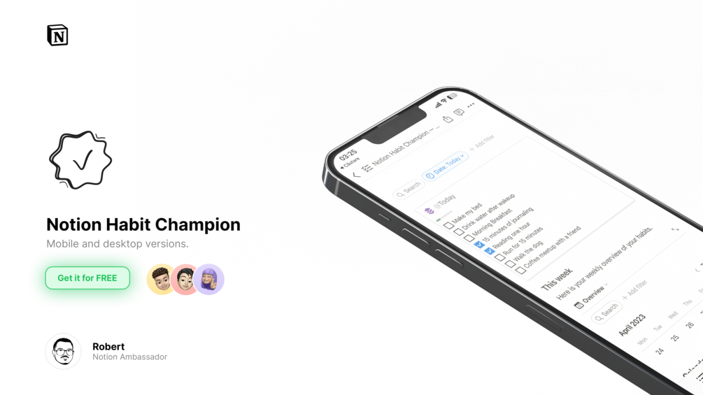 I created the Notion Habit Champion Template. It's the one place to track all of your habits. Just a few taps to track your progress.